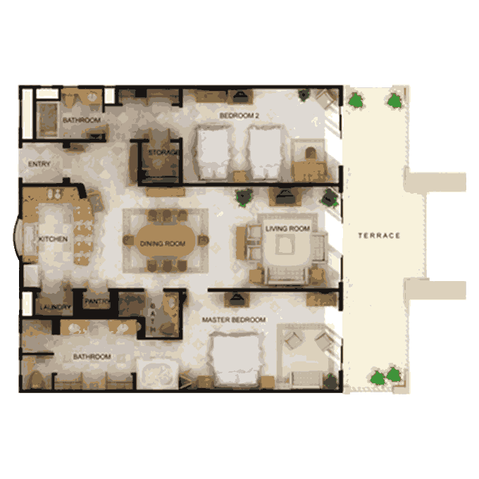 Don't be surprised if your Two Bedroom Villa starts to feel like home. From preparing a meal in the state-of-the art kitchen, serving it in the dining room, to winding down on the living room couch in front of the television, it has everything you need... and more. A king size bed and adjoining spa bathroom make up the master bedroom, while the second bedroom features two queen size beds. Measuring 2,212 square feet (105.51 square meters) and opening to an oversized balcony, this room gives you the freedom to stretch. A pillow menu, premium bedding, and cotton linens invite a good night's sleep. Soft bathrobes and designer toiletries help you relax. Complimentary wired and wireless Internet access keeps you connected while LCD televisions offer you entertainment. A premium stock mini-bar is available on request, and a coffee/tea maker is also supplied. Take advantage of the modern open-style kitchen, tastefully finished in granite counter tops, with an in-room private chef available for any meal. You will also enjoy daily turn down service and a welcoming hand massage upon check in.