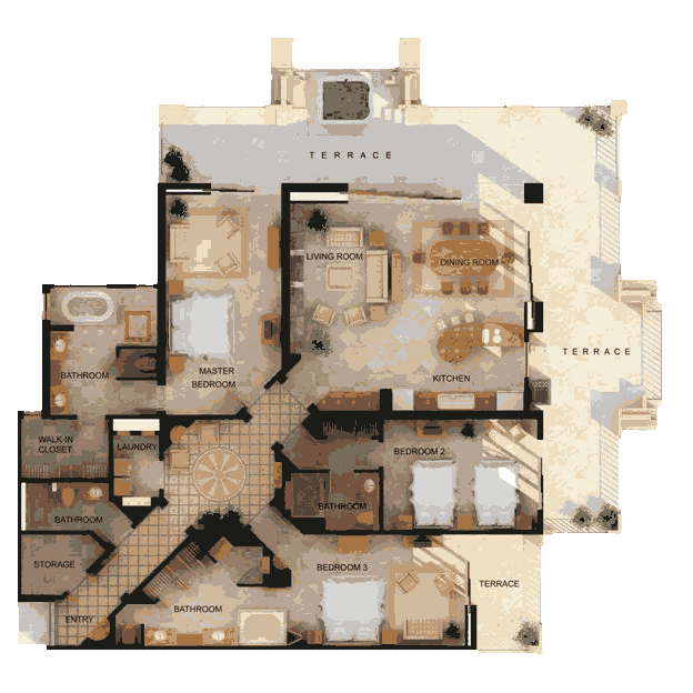 The rooms are airy and sleekly contemporary in this Three-Bedroom Suite which features two master bedrooms, each one complemented by its own spa bathroom with marble shower, whirlpool tub and Travertine marble. Measuring 2,790 square feet (260 square meters), this room opens to a oversized balcony with the convenience of whirlpool spas and designer BBQ grills. A pillow menu, premium bedding, and cotton linens invite a good night's sleep. Bathroom amenities include bathrobes and designer toiletries. Complimentary wired and wireless Internet access keeps you connected, and the LCD-Screen Televisions offered for your entertainment. Enjoy daily turn down service after a welcoming hand massage ritual upon check in Premium stock minibar on request and a coffee/tea maker are supplied. In room private chef available to take advantage of the modern open style kitchen tastefully finished with pristine granite counter tops.